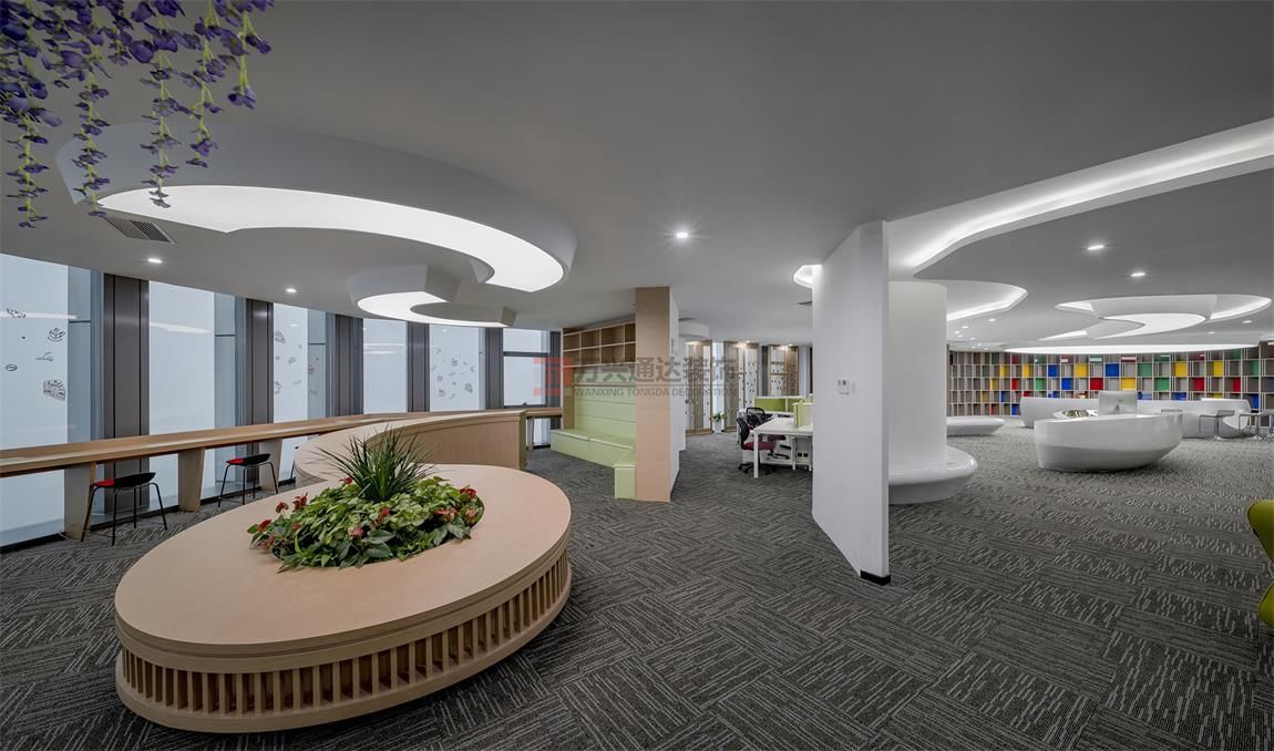 辦公室裝修公司案例:整體辦公空間設(shè)(shè)計(jì)中,大氣與細(xì)致并存,將設(shè)(shè)計(jì)與藝術(shù)(shù)結(jié)(jié)合。設(shè)(shè)計(jì)理念: 室內(nèi)(nèi)設(shè)(shè)計(jì)元素均交織凝聚于行云流水的曲線(xiàn)流動(dòng)空間,設(shè)(shè)計(jì)表現(xiàn)(xiàn)形式不受拘束,每個(gè)空間都有自己特殊的弧度,致力于搭建“創(chuàng)(chuàng)新+智能+生態(tài)(tài)”的辦公環(huán)(huán)境。